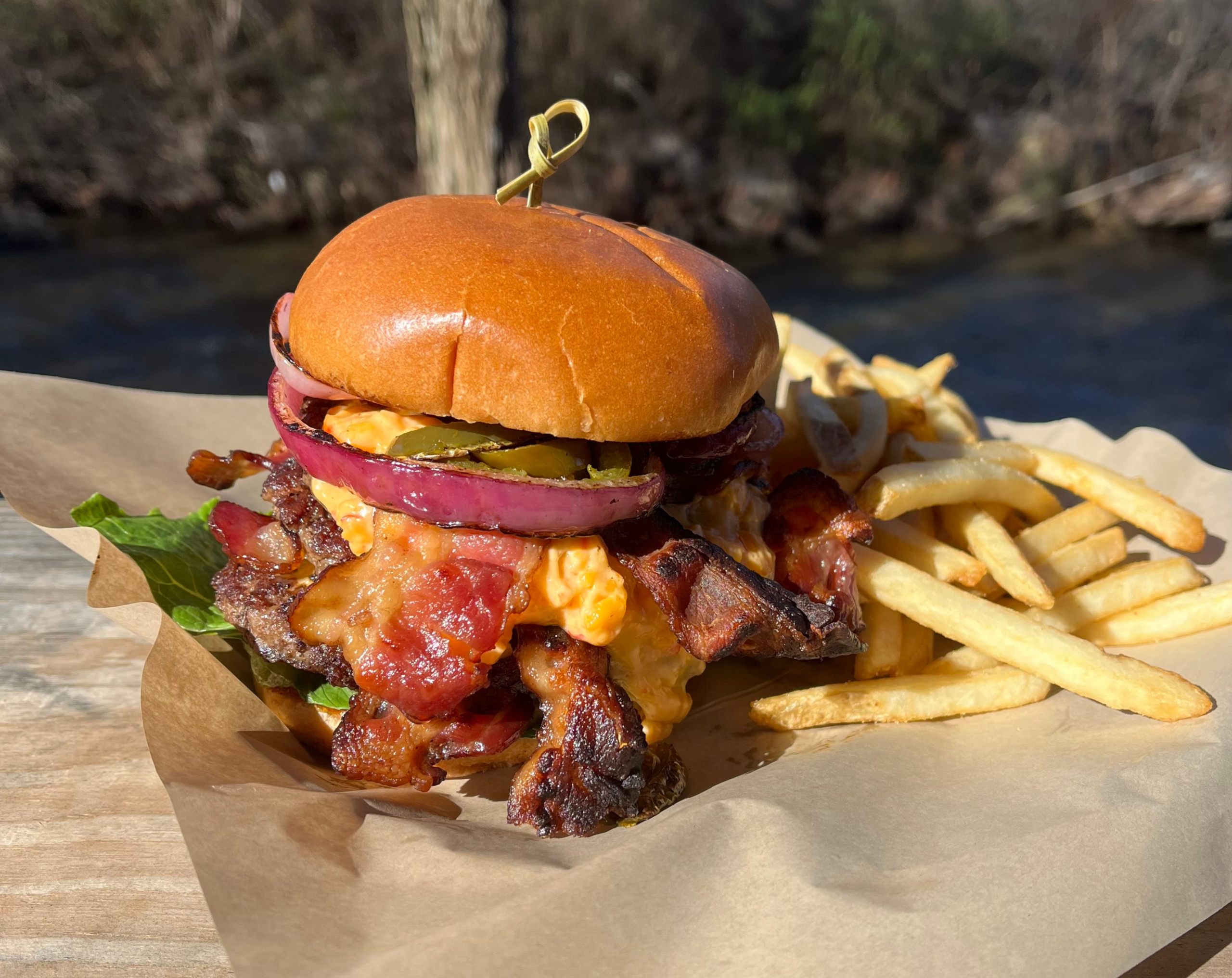 Deliciously tender frog legs…just kidding! Three burger patties smashed and cooked to perfection with bacon between every patty, topped with grilled jalapenos & onions, bacon habanero jam, lettuce & pimento cheese on a toasted brioche bun.