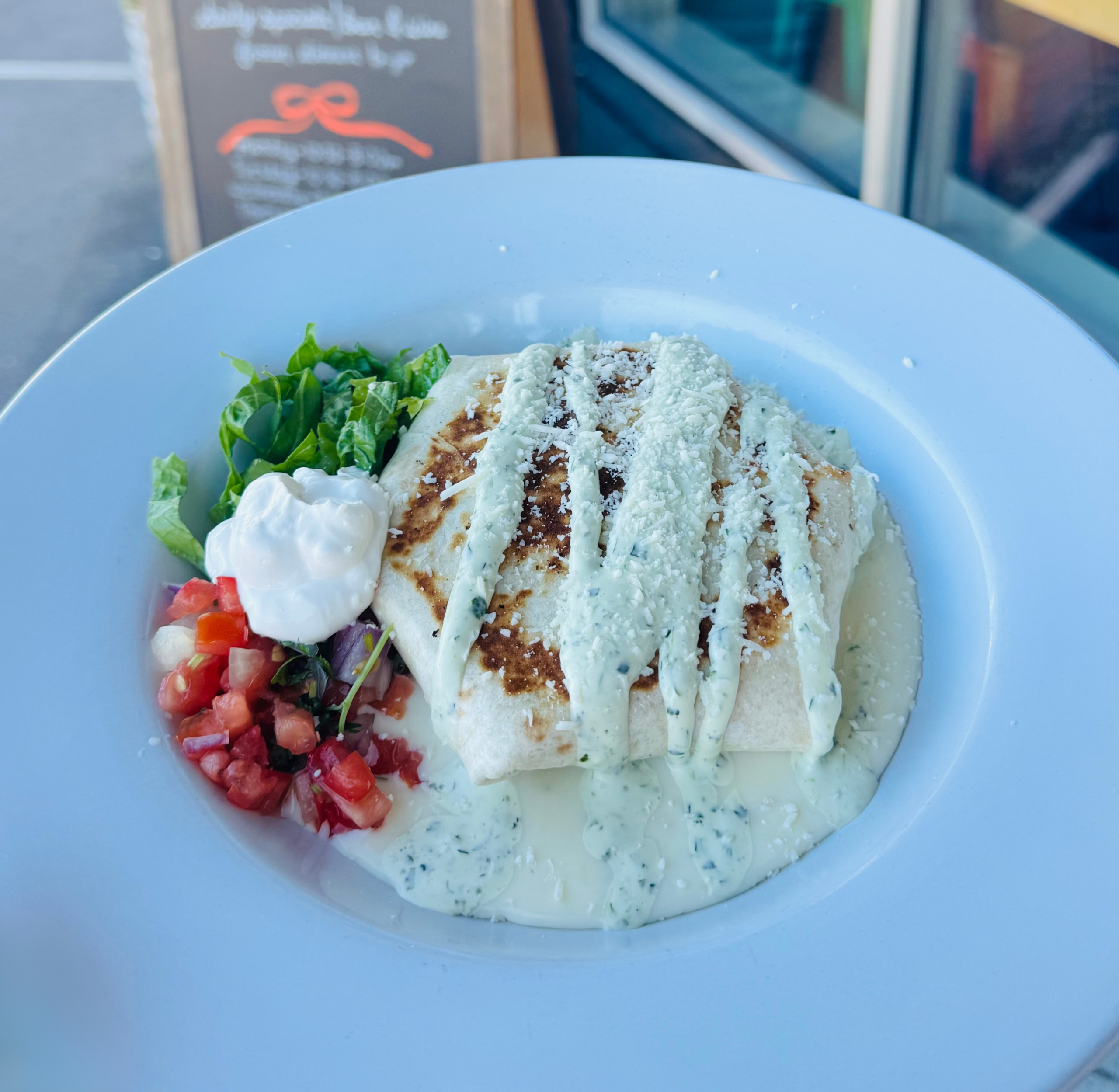 Chuck, short rib and brisket burger with cheddar-jack cheese and taco seasoning wrapped in a flour tortilla, grilled & topped with lettuce, pico de gallo, sour cream, queso, guacamole, chips, cotija cheese and cilantro crema.