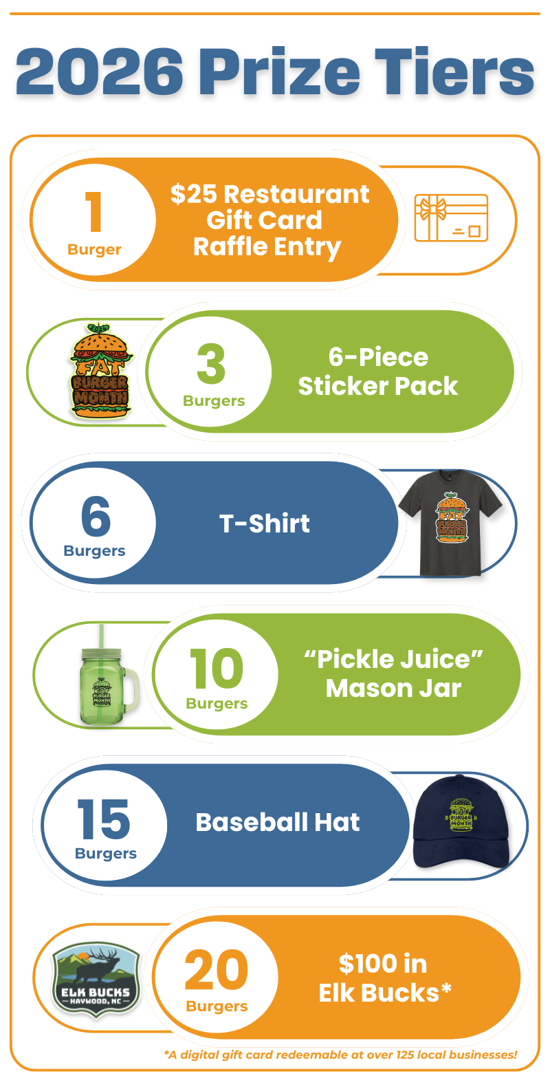 - Get started by picking up your Fat Burger Month sticker card, which you’ll use to track your burger-eating progress. Sticker cards are available at participating restaurants and at the Visit Haywood Welcome Center.