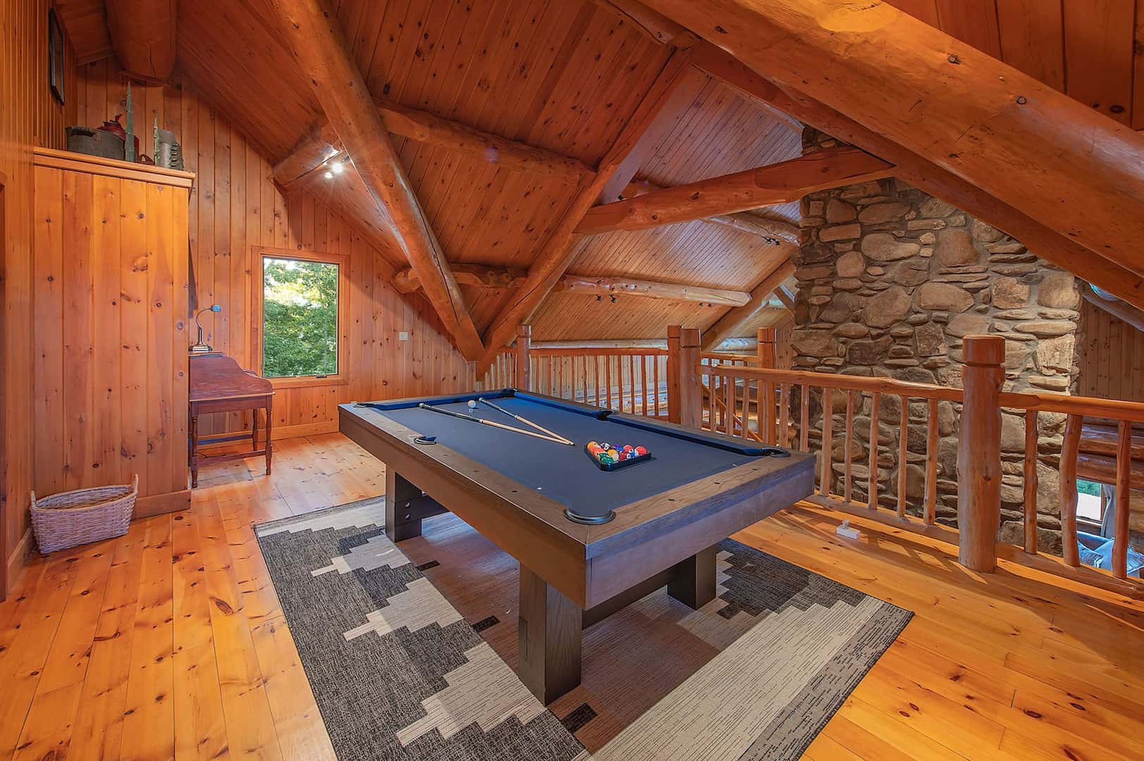 The lodge sits atop its own peak, offering 360º panoramic views of the Smokies. This perfectly isolated luxury cabin was meticulously constructed of logs shipped from British Columbia and stone cut from the property. There are few cabins as grand and authentic as this one in the greater Asheville region. Out every window is a breathtaking view – like sitting on top of the world.